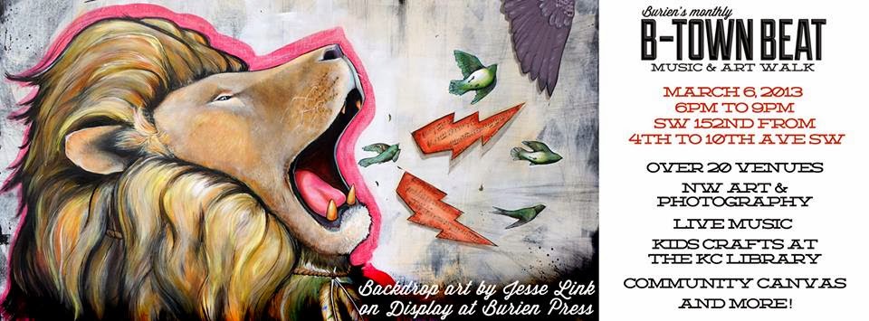 The 1st Thursday Art Walk (B-Town Beat) in Burien. Thursday, 7 March from 6-9pm. Selected shows: